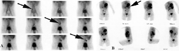 A, ở bệnh nhân nam 17 tuổi, hình ảnh túi thừa Meckel là bóng tròn nhỏ từ từ hiện rõ qua theo thời gian chụp (mũi tên). B, bệnh nhân 4 tuổi, túi thừa Meckel bắt đầu hiện rõ ở 45 phút sau tiêm ( mũi tên). (Angela D. Levy, Christine M. Hobbs (2004). Meckel Diverticulum: Radiologic Features with