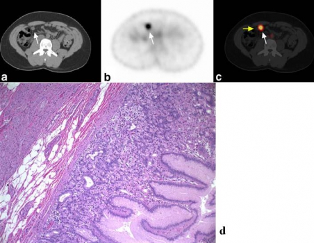 Hình 11: a, CT thấy đoạn ruột tận, ở ngang rốn bên phải (mũi tên). b, SPECT, chất đánh dấu phóng xạ tập trung ở giữa bụng bên phải. c, hình fused SPECT/CT cấu trúc có đầu tận phù hợp với túi thừa Meckel (mũi tên trắng), phần không hiện thị trên hình fused SPECT/CT (mũi tên vàng) được xem là do nhu động ruột. d, hình giải phẫu bệnh cho thấy niêm mạc dạ dày lạc chỗ trong túi thừa. (Jonathan R. Dillman Æ Ka Kit Wong et al (2009). Utility of SPECT/CT with Meckel’s scintigraphy. Ann Nucl Med 23:813–815.)