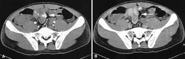 Hình 12: A, CT cản quang thì động mạch, hình ảnh thoát thuốc cản quang từ cổ túi thừa Meckel ở đoạn xa hồi tràng (mũi tên). B, Thì trễ, hình ảnh tăng đậm độ và lẫn thuốc cản quang trong lòng túi thừa do xuất huyết ( mũi tên).
