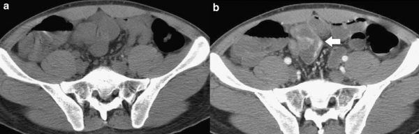 Hình 13: Xuất huyết tiêu hóa do niêm mạc dạ dày lạc chỗ trong túi thừa Meckel ở bệnh nhân nam 22 tuổi. A, CT không cản quang. B, thuốc cản quang thoát vào lòng túi thừa Meckel (Alexandra Platon, Pascal Gervaz et al (2010). Computed tomography of complicated Meckel’s diverticulum in adults: a pictorial review. Insights Imaging 1:59)