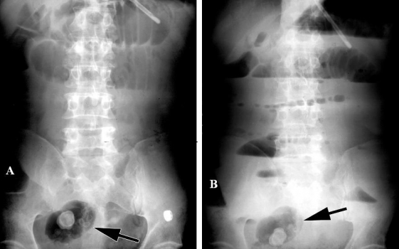 Hình 14: Tắc ruột non do xoắn túi thừa Meckel ở bệnh nhân nam 30 tuổi. A, x quang bụng nằm ngửa, B chụp bụng đứng. Một bóng khí hình oval chứa nhiều nốt vôi dạng viền bên trong ở ¼ bụng dưới phải (mũi tên). Sau phẫu thuật là túi thừa Meckel bị xoắn (Angela D. Levy, Christine M. Hobbs (2004). Meckel Diverticulum: Radiologic Features with Pathologic Correlation. RadioGraphics 24:578)