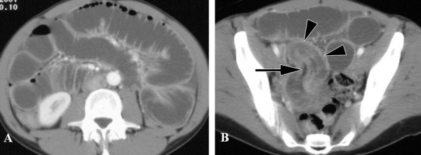Hình 15: Tắc ruột do lồng ở bệnh nhân nữ 41 tuổi bị nhồi máu và hoại tử túi thừa Meckel. A, các quai ruột non trên đoạn tắc giãn lớn. B, đoạn hồi tràng bị lồng, đoạn ruột non thành dày phù nề (đầu mũi tên). Điểm giữa đoạn lồng có mỡ giảm đậm độ (mũi tên). Sau phẫu thuật : nhồi máu và hoại tử túi thừa Meckel là nguyên nhân gây lồng hồi – hồi tràng. (Angela D. Levy, Christine M. Hobbs (2004). Meckel Diverticulum: Radiologic Features with Pathologic Correlation. RadioGraphics; 24:578)