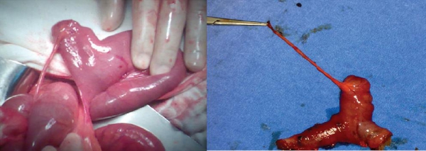 Hình 16: Tắc ruột do dải xơ của túi thừa Meckel ở bệnh nhân nam 17 tuổi. Hình ảnh phẫu thuật cho thấy dải xơ nối túi thừa Meckel và mạc treo, bên trong chứa mạch máu nuôi túi thừa.(Aziz Sumer et al (2010). Small Bowel Obstruction due to Mesodiverticular Band of Meckel’s Diverticulum: A Case Report. Hindawi Publishing Corporation Case Reports in Medicine. Article ID 901456; p2)