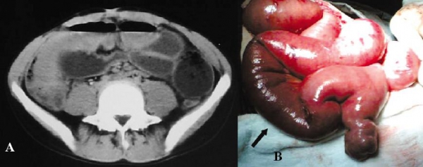 Hình 17: Hoại tử hồi tràng do chui vào thòng lòng được tạo bởi đầu tận cùng túi thừa Meckel dính với măt lưng mạc treo ở bệnh nhân nam 32 tuổi. A, CT quai ruột non dãn lớn, đoạn hồi – manh tràng xẹp nên nghi ngờ tắc ở hồi tràng. B, phẫu thuật: túi thừa Meckel và đoạn hồi tràng bị hoại tử. (Oguzhan KARATEPE. Cem DURAL et al (2008). Rare Complication of Meckel’s Diverticulum: Loop Formation of Diverticulum. Turk J Med Sci; 38 (1): 92.)