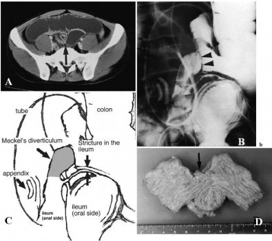 Hình 18: A, CT các quai ruội non dãn, hồi tràng dính vào thành bụng sau (mũi tên). B, x quang thấy ổ đọng thuốc tròn khoảng 5 cm (đầu mũi tên). C, Hình mô tả vị trí túi thừa Meckel. D, đại thể: túi thừa Meckel, cổ túi thừa dính vào thành bụng sau (mũi tên), không phát hiện viêm hay loét. (C. Yamamoto et al (2003).: Meckel’s diverticulum adherent to abdominal wall. Journal of Gastroenterolory ; 38:195)