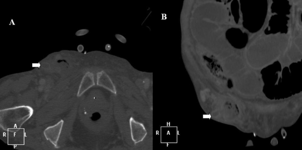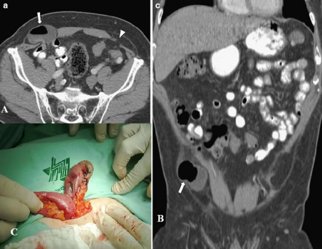 Hình 20: Bệnh nhân nữ 70 tuổi nhập viện vì đau bụng nôn ói. Hình CT thấy cấu trúc hình ống bắt quang thành ở trong ống đùi phải được nhận định là ruột thừa(mũi tên), các quai ruột non dãn lớn. Sau phẫu thuật: hồi tràng và túi thừa Meckel cách van hồi manh tràng 60 cm, ruột thừa và manh tràng thoái vị vào trong ống đùi phải. Túi thừa Meckel bị dò tạo ổ abscess kèm ruột thừa viêm trong ống đùi phải. (A. W. Phillips · S. R. Aspinall. CASE REPORT. Appendicitis and Meckel’s diverticulum in a femoral hernia: simultaneous De Garengeot and Littre’s hernia. Springer Published online 27 march 2011).