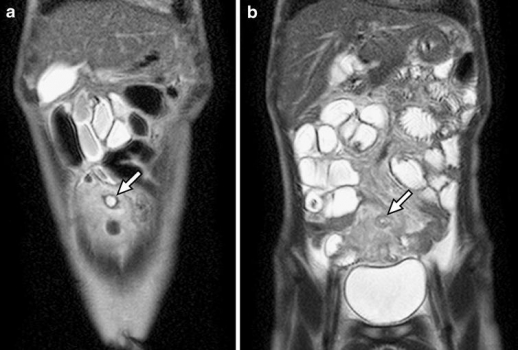 Hình 7: Hình coronal T2W SSTSE (Single – short turbo spine-echo) cho thấy cấu trúc hình ống có đầu tận cùng nằm giữa dưới rốn, chứa đầydịch (mũi tên). Mỡ mạc treo có tín hiệu không đồng nhất do viêm. (Shilpa Hegde. Jonathan R. Dillman. Samir Gadepalli et al (2012). MR enterography of perforated acute Meckel diverticulitis. Springer Pediatr Radiol 42:259).