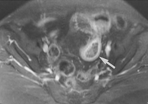Hình 6: Hình T1W xóa mỡ sau tiêm thuốc cản từ, túi thừa Meckel có dạng hình giọt nước (mũi tên). Lớp trong bắt thuốc cản từ mạnh hơn lớp niêm mạc của đại tràng và hồi tràng, đó là lớp niêm mạc dạ dày lạc chỗ. (Diego R. Martin, Ersan Altun, Jorge Elias et al (2010). Gastrointestinal tract. In: Richard C. Semelka. Abdominal – pelvic MRI 3rd
