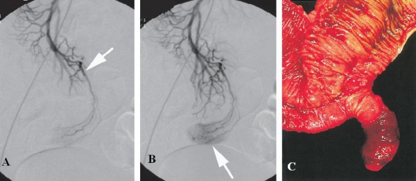 Hình 8: Hình ảnh túi thừa Meckel ở bệnh nhân nữ 22 tuổi bị đau bụng và thiếu máu mạn. A, Hình DSA thấy động mạch rốn ruột bắt nguồn từ đoạn xa nhánh hồi tràng của động mạch treo tràng trên (mũi tên). B, thì động mạch trễ cho thấy đám mạch máu có dạng ống ở bờ của túi thừa (mũi tên). C, Sau phẫu thuật : túi thừa Meckel xuất huyết. (Angela D. Levy, Christine M. Hobbs (2004). Meckel Diverticulum: Radiologic Features with Pathologic Correlation. RadioGraphics; 24:577)