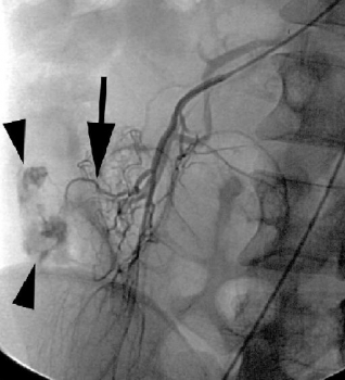 động mạch hồi đại tràng thấy xuất huyết ở nhánh gần (mũi tên). Thuốc cản quang thoát vào lòng ruột non (đầu mũi tên).